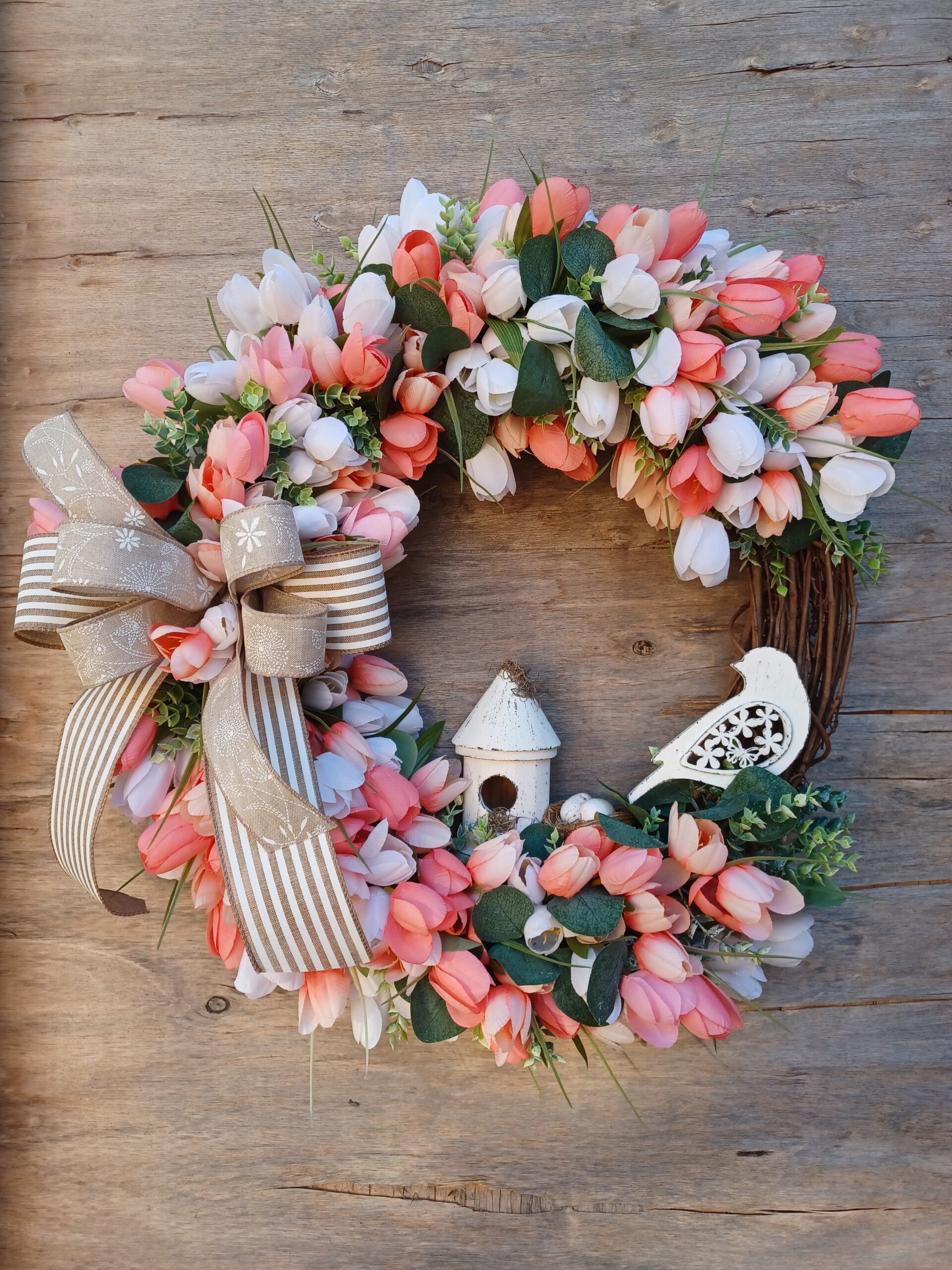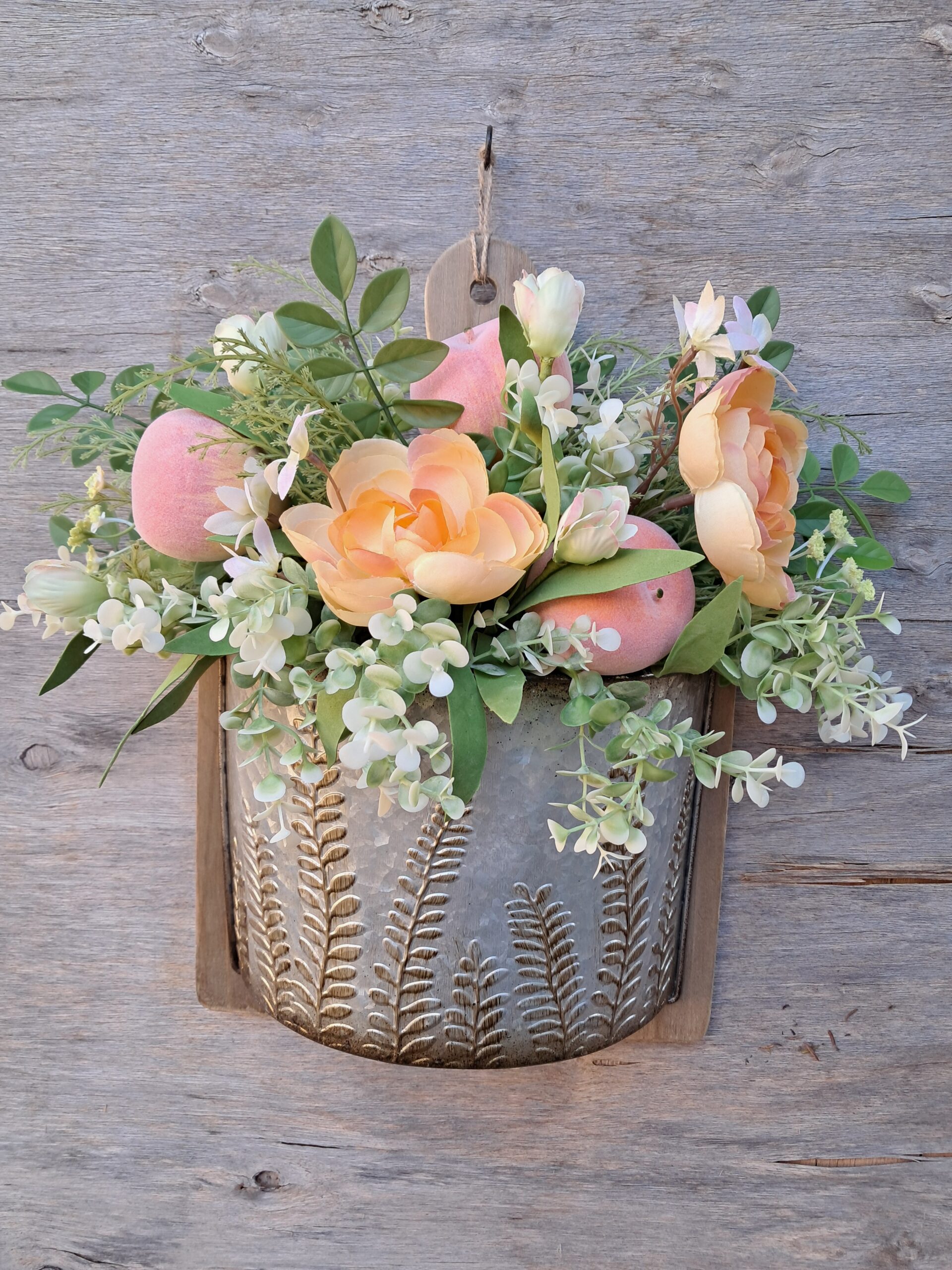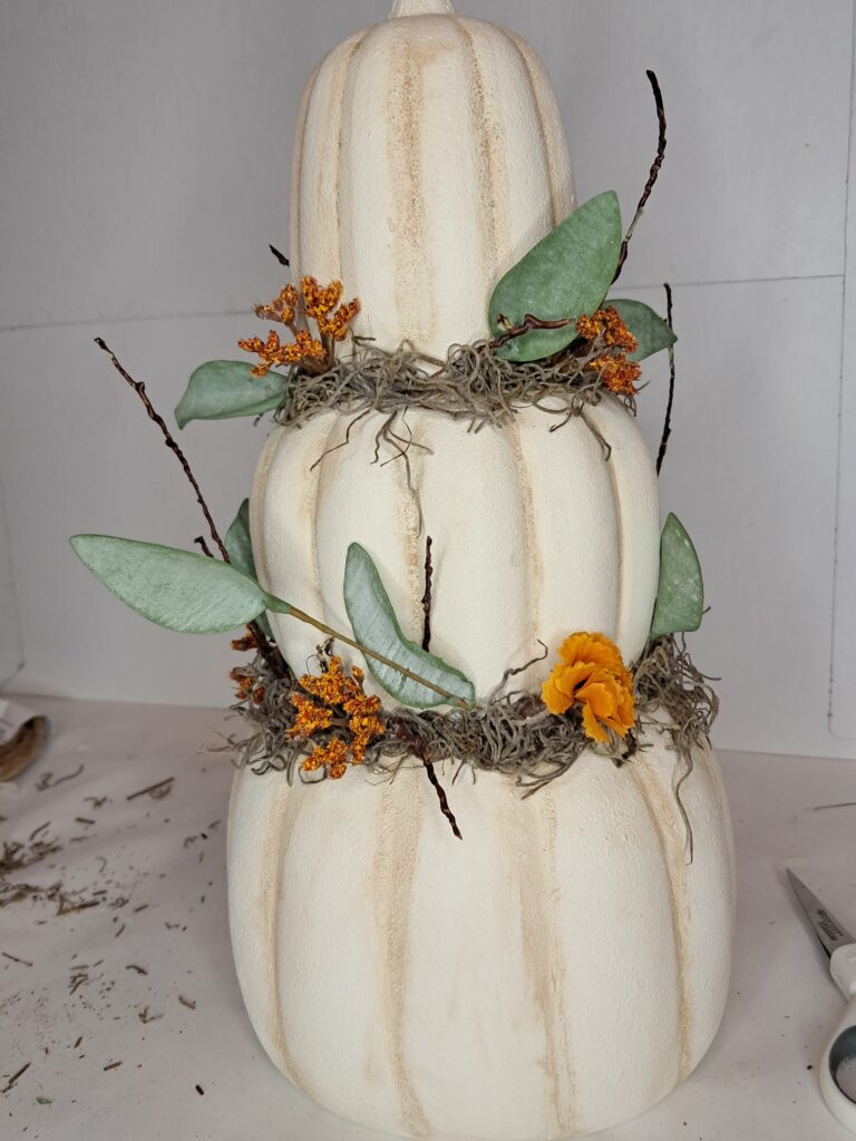 Using hot glue, I adhered Spanish moss in between the pumpkins. I also added greenery, flowers, and tendrils. The tendrils pictured below came from the bush of greenery that I used.