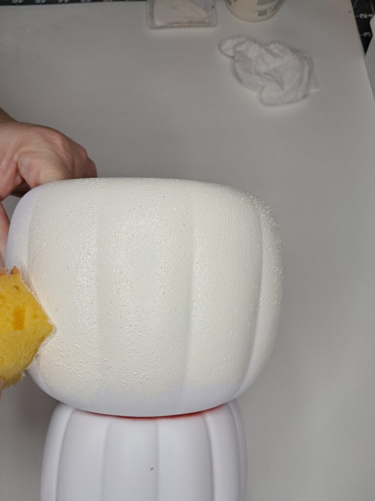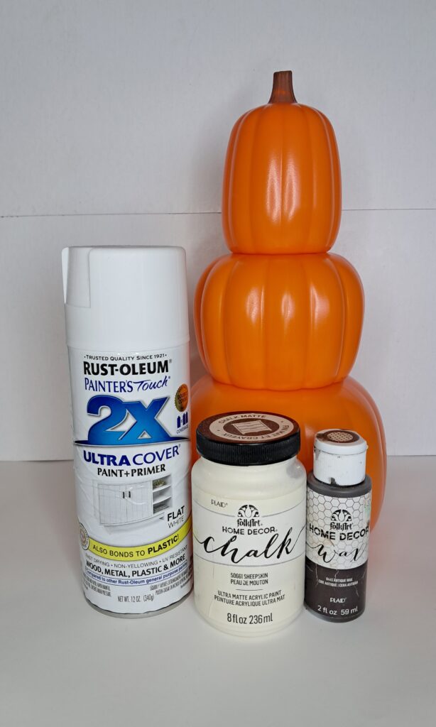 I began by adhering the pumpkins together using E6000. I then used white paint/primer to spray the stack with two coats. I wanted to cover up the orange and ensure that the chalk paint would properly adhere to the plastic in the next step.