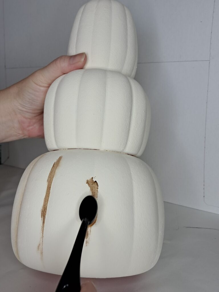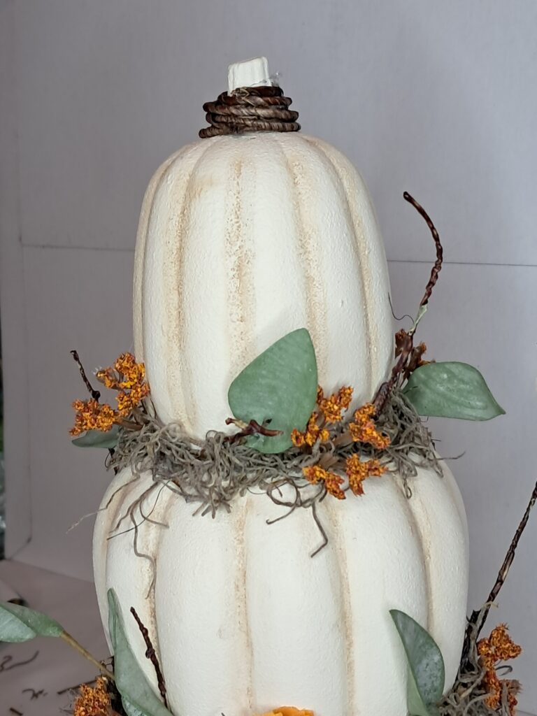 To give the stack more dimension, I added antiquing wax to the grooves of each pumpkin. I used a soft brush to add the wax, then I wiped off the excess wax with a baby wipe. I allowed the pumpkins to thoroughly dry, and then sprayed a coat of clear matte sealer.