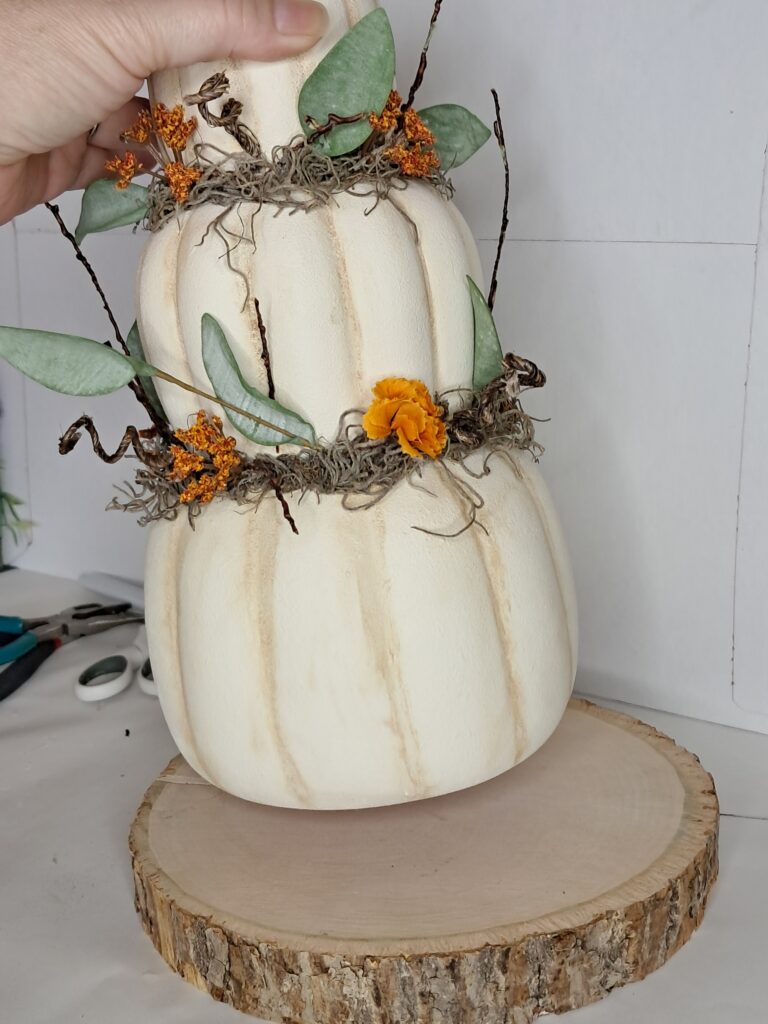 I added Spanish moss, greenery, and florals to the base of the pumpkins. I also used orange pip berry wire to add more curled tendrils to the stack. The makeover was now complete! Would you ever guess this started as a dollar store find?