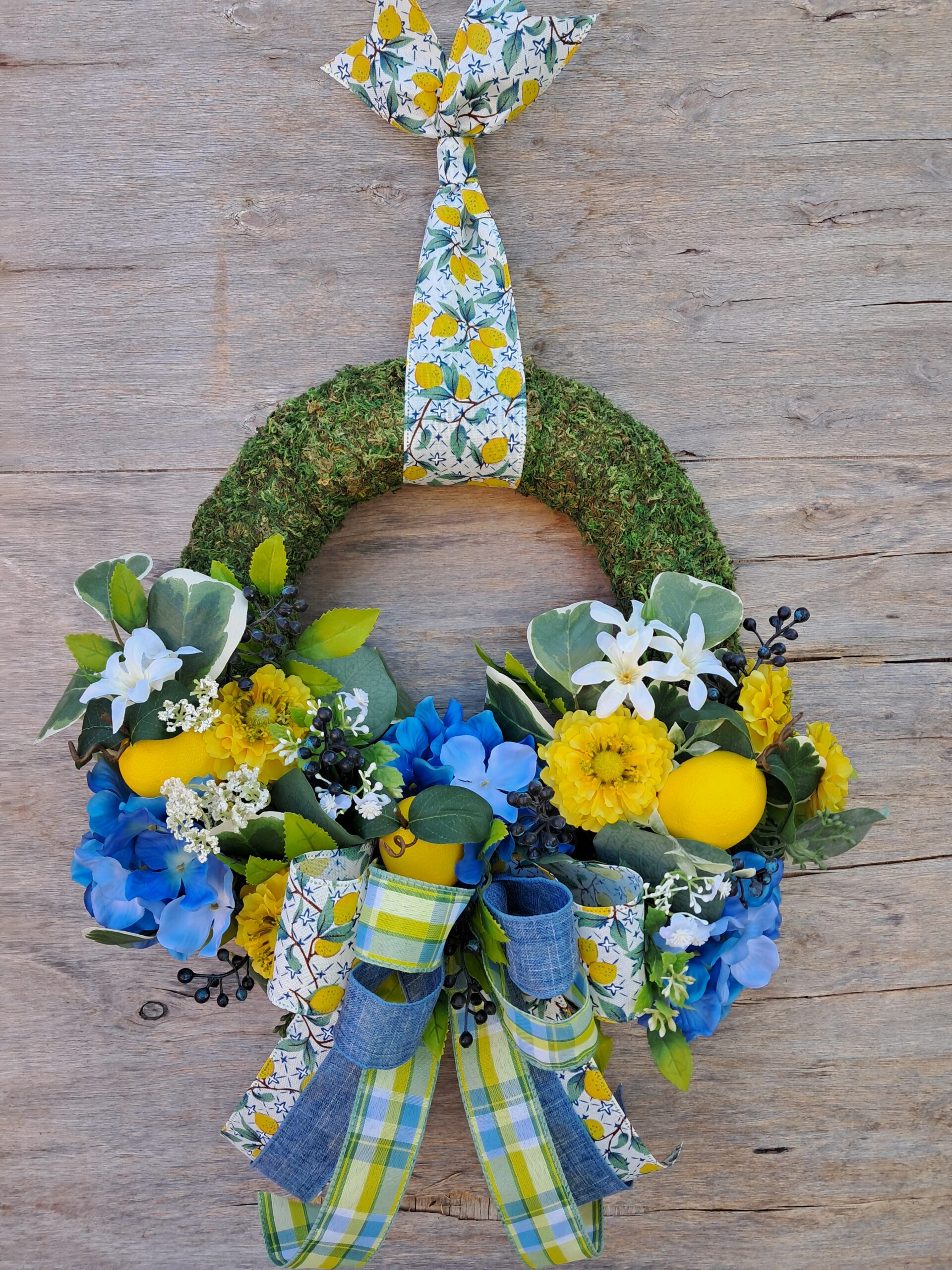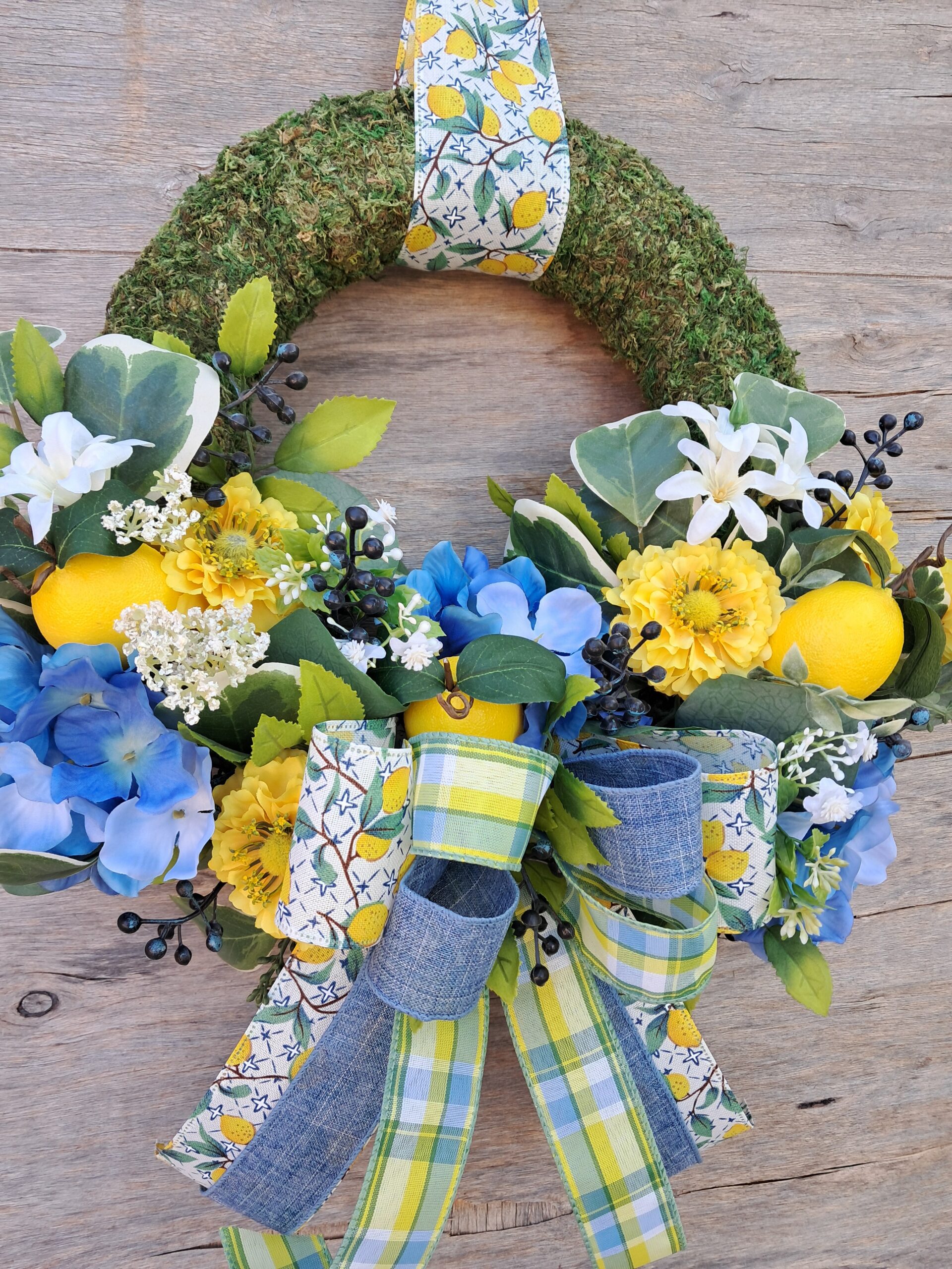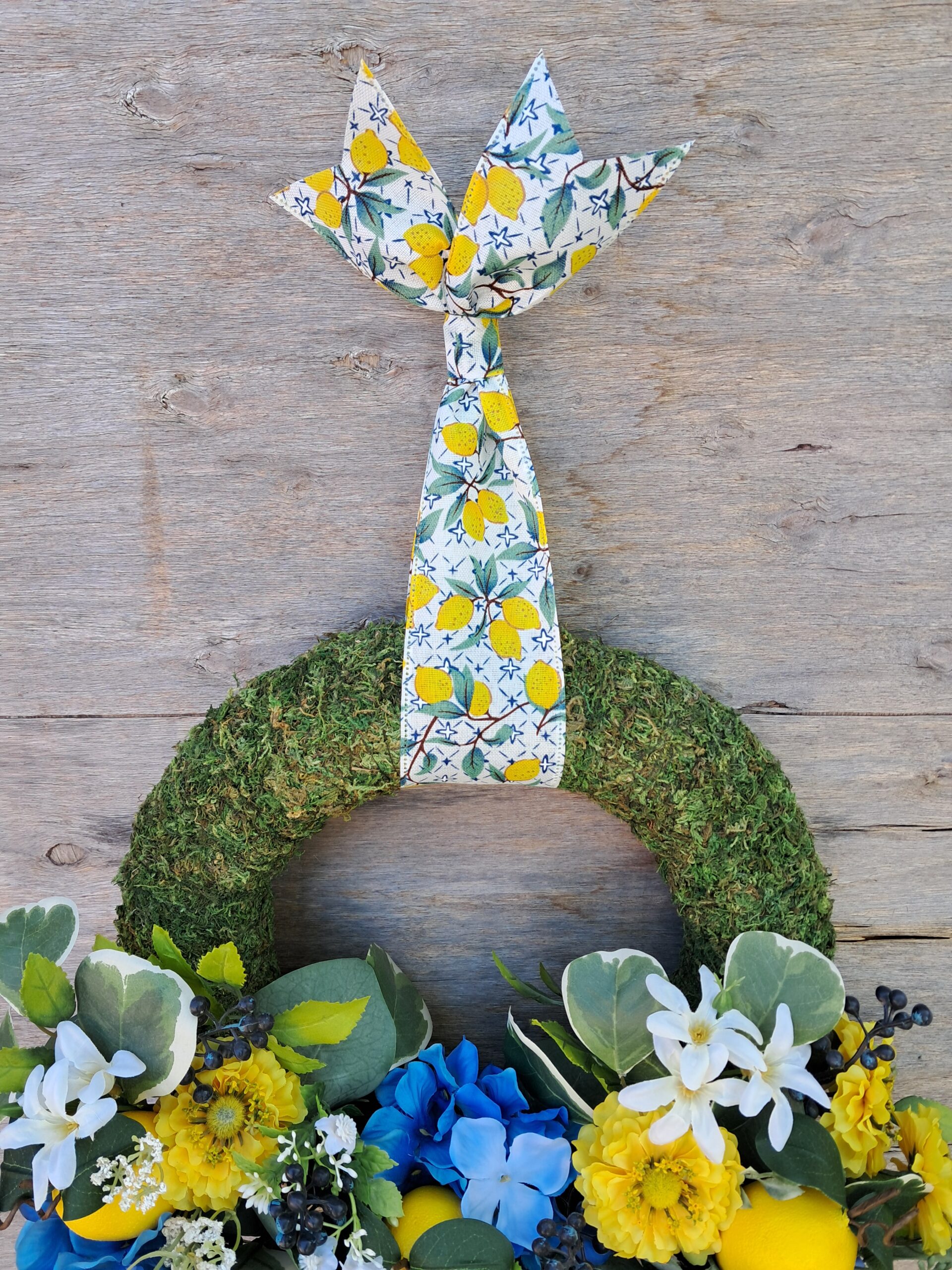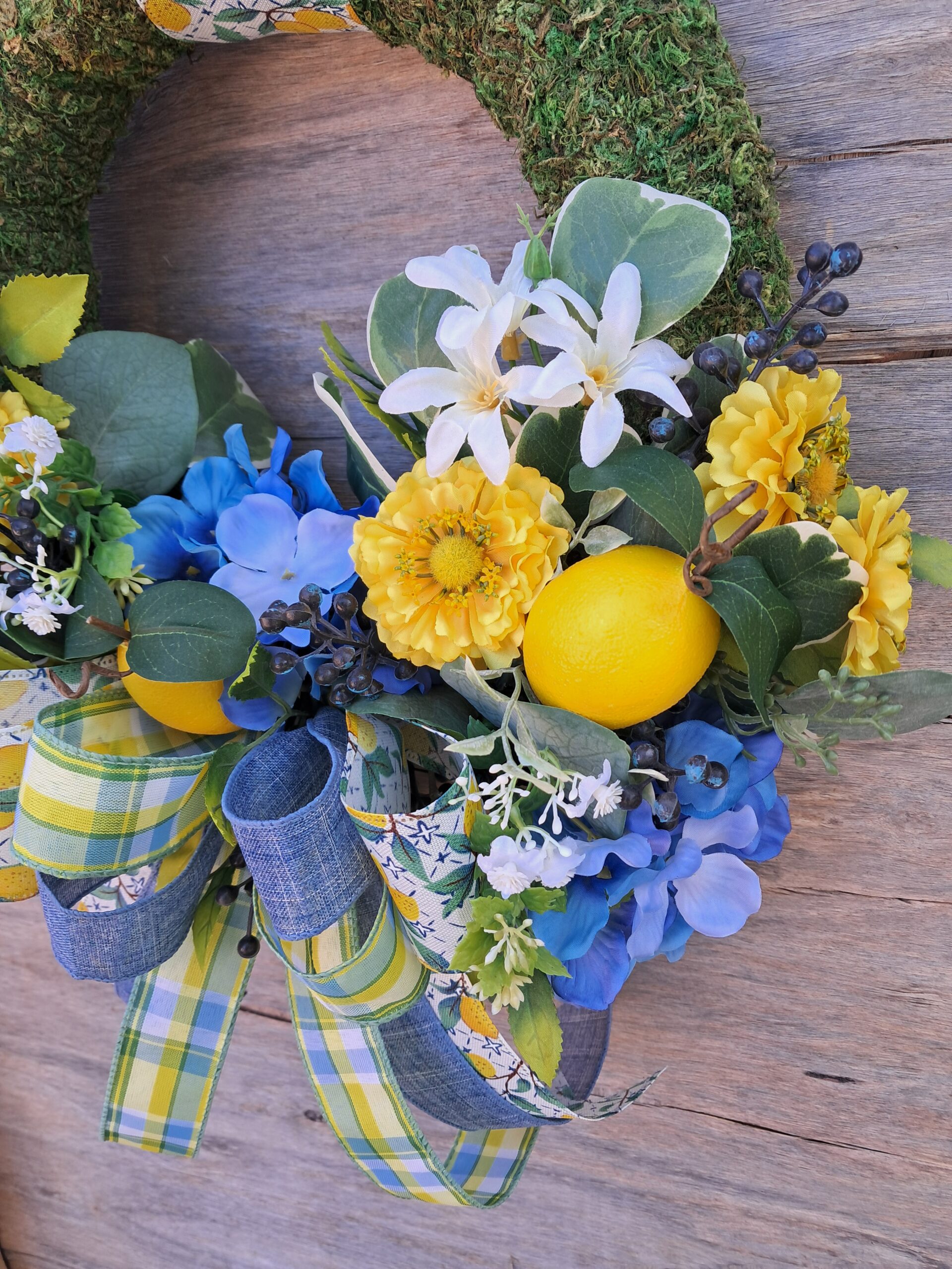 Welcome guests with this whimsical lemon and berry moss wreath. Featuring a round moss base, it is adorned with a stunning multi-ribbon bow that complements a vibrant arrangement of lemons, blue hydrangeas and cheerful yellow zinnias. Accented with eucalyptus and berries, this wreath effortlessly brings the charm of spring and summer to any space. Its timeless design makes it perfect for year-round display—whether gracing your front door, a cozy interior wall, or an elegant interior door. Elevate your home’s entrance with this beautiful piece, designed to impress and delight.