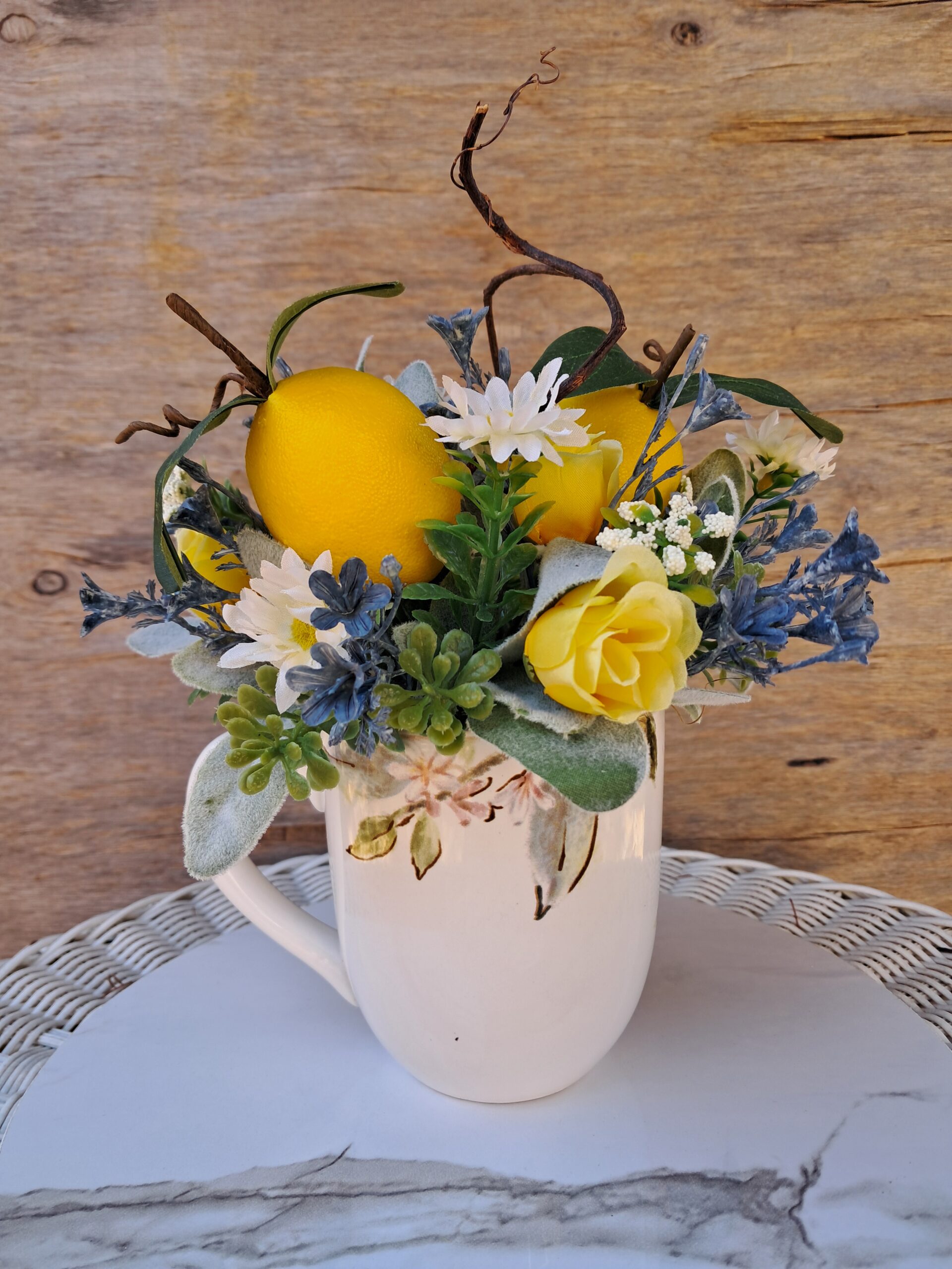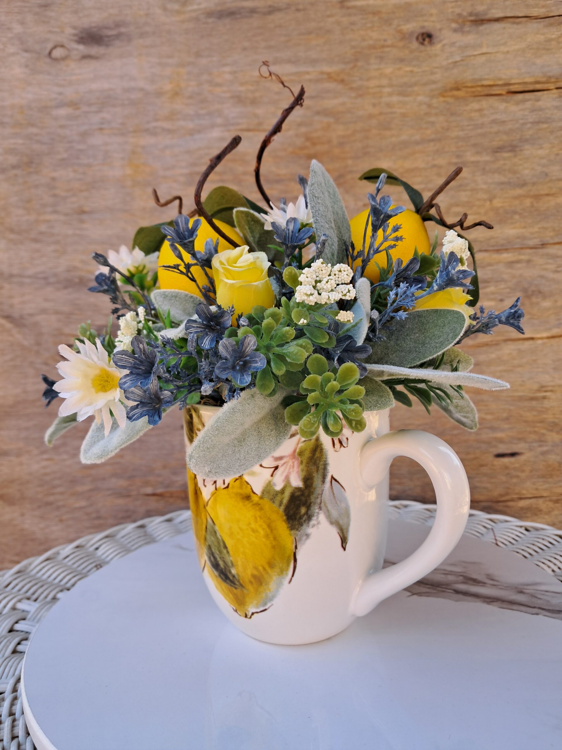 Bring a touch of timeless charm and sunshine to your space with this elegant lemon-themed mug arrangement. Housed in a ceramic mug adorned with a classic lemon motif, this graceful display offers a fresh burst of color and cheer—perfect for a kitchen shelf, windowsill, or as a thoughtful gift for the lemon lover in your life.