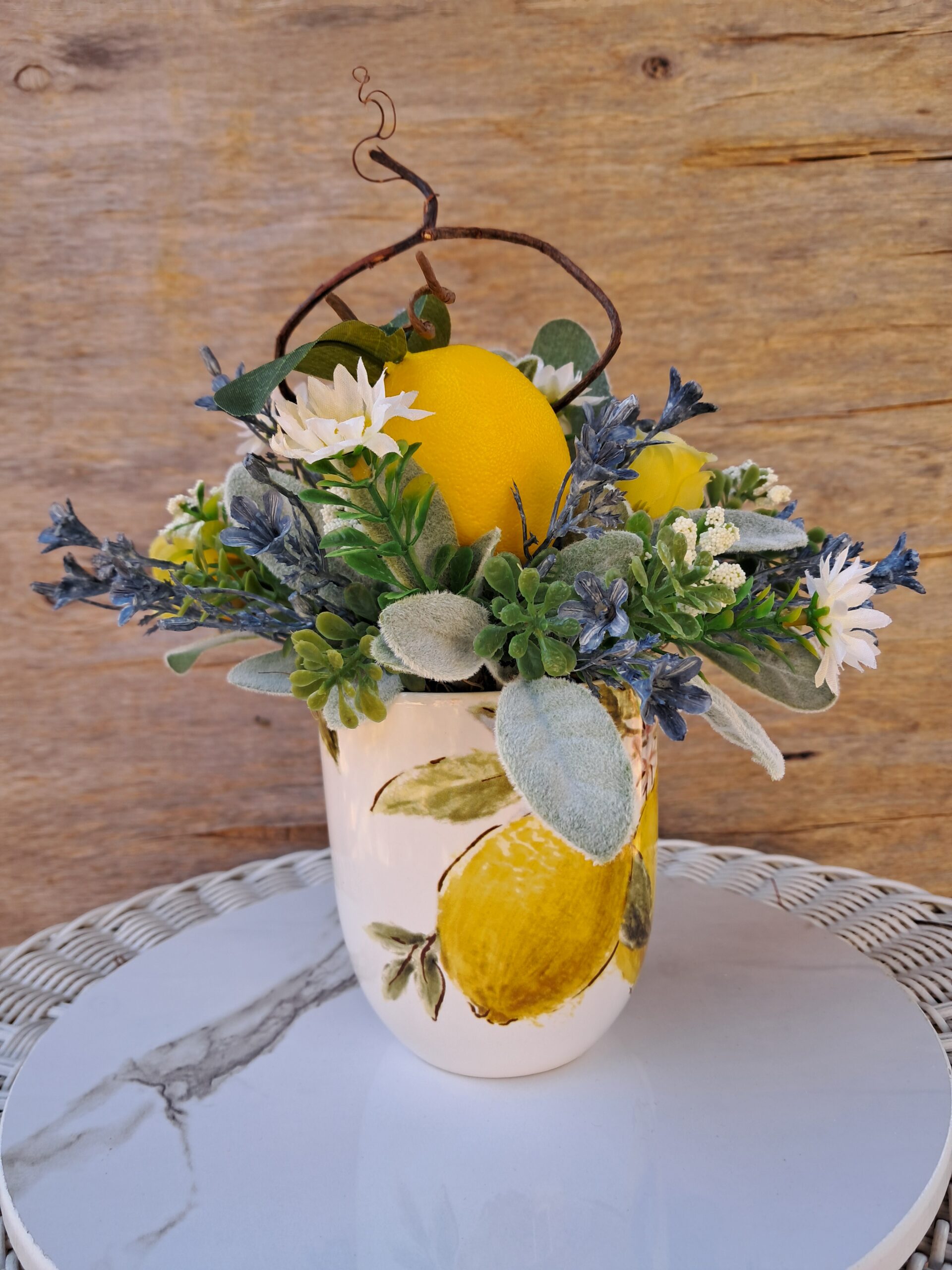 At the heart of the arrangement, lifelike faux lemons are artfully arranged among soft yellow mini roses, delicate daisies, airy blue wax flowers, velvety lamb’s ear, and rich mini boxwood greenery. Natural grapevine tendrils weave through the design, lending an organic, refined touch.