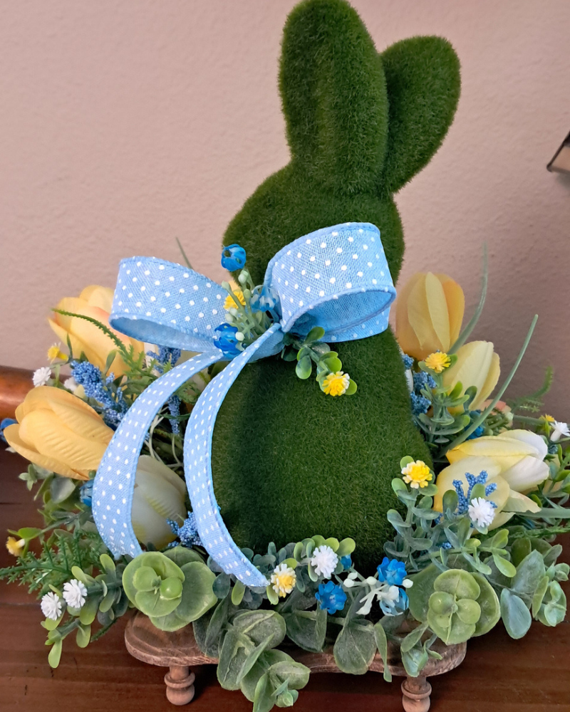 Add some charm to your spring decor with this one-of-a-kind moss bunny tulip arrangement! Designed on a rustic riser, this faux floral centerpiece features an adorable moss bunny nestled among a lush mix of yellow tulips, sweet wildflowers, and soft blue heather. Layers of boxwood and fern add fullness, texture, and a natural cottage garden feel. The bunny is finished with a beautiful blue Swiss dot bow, adding to the rustic elegance and springtime whimsy of this centerpiece.