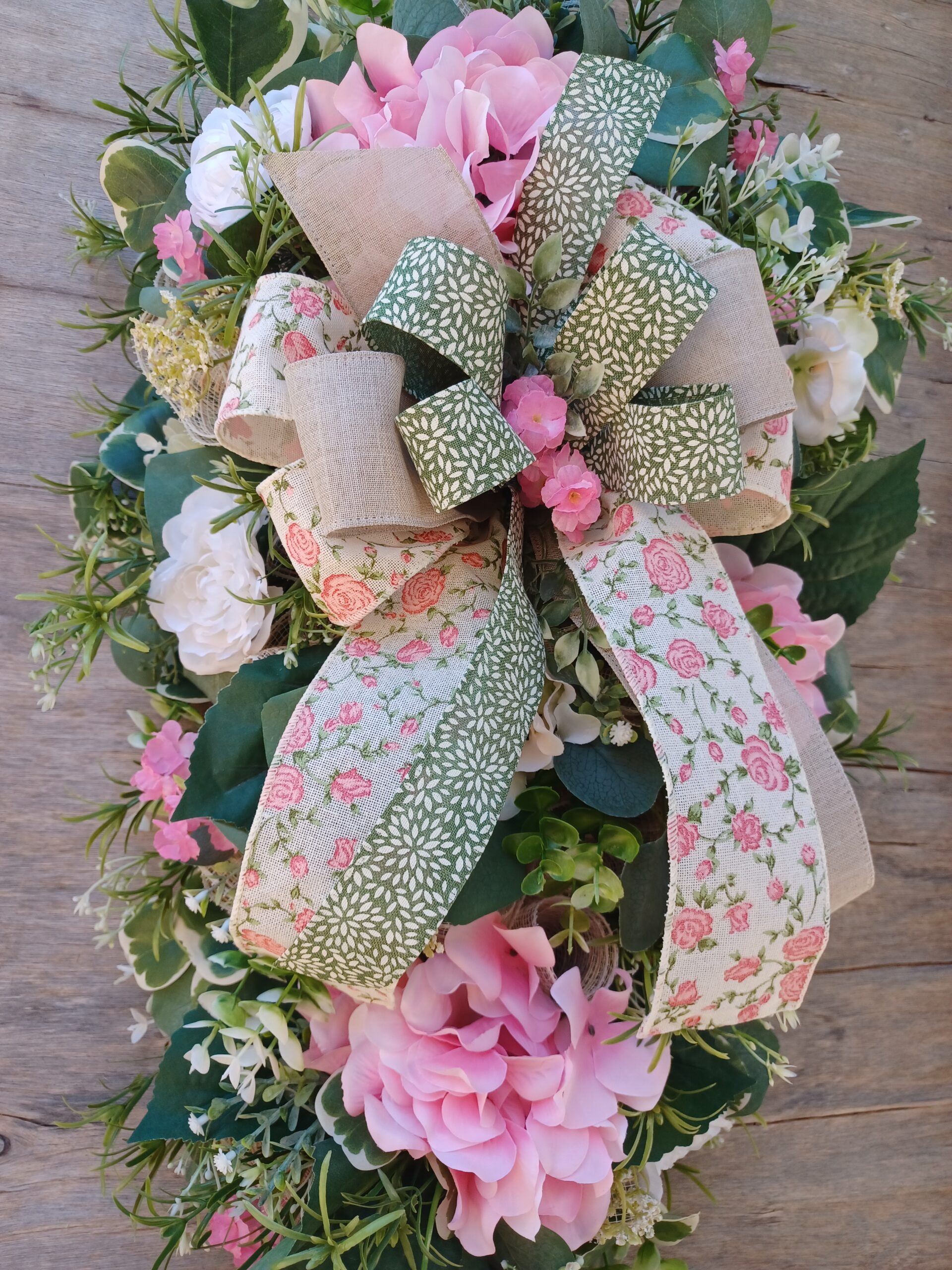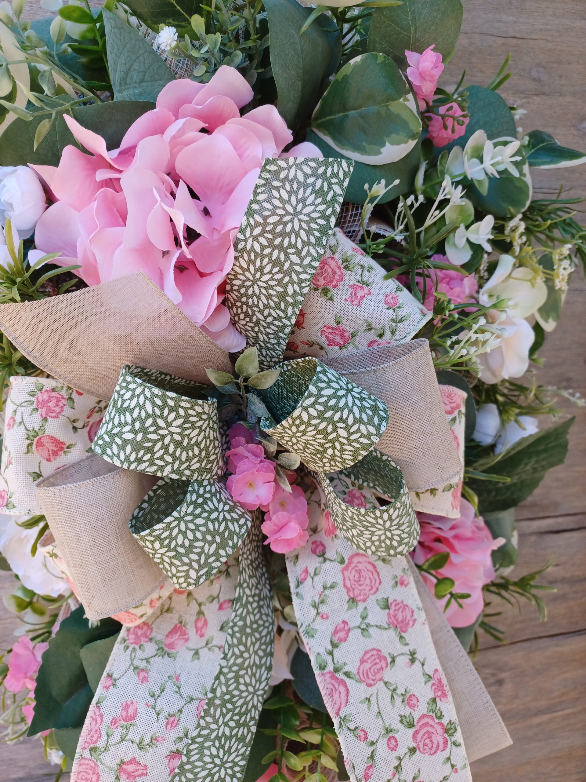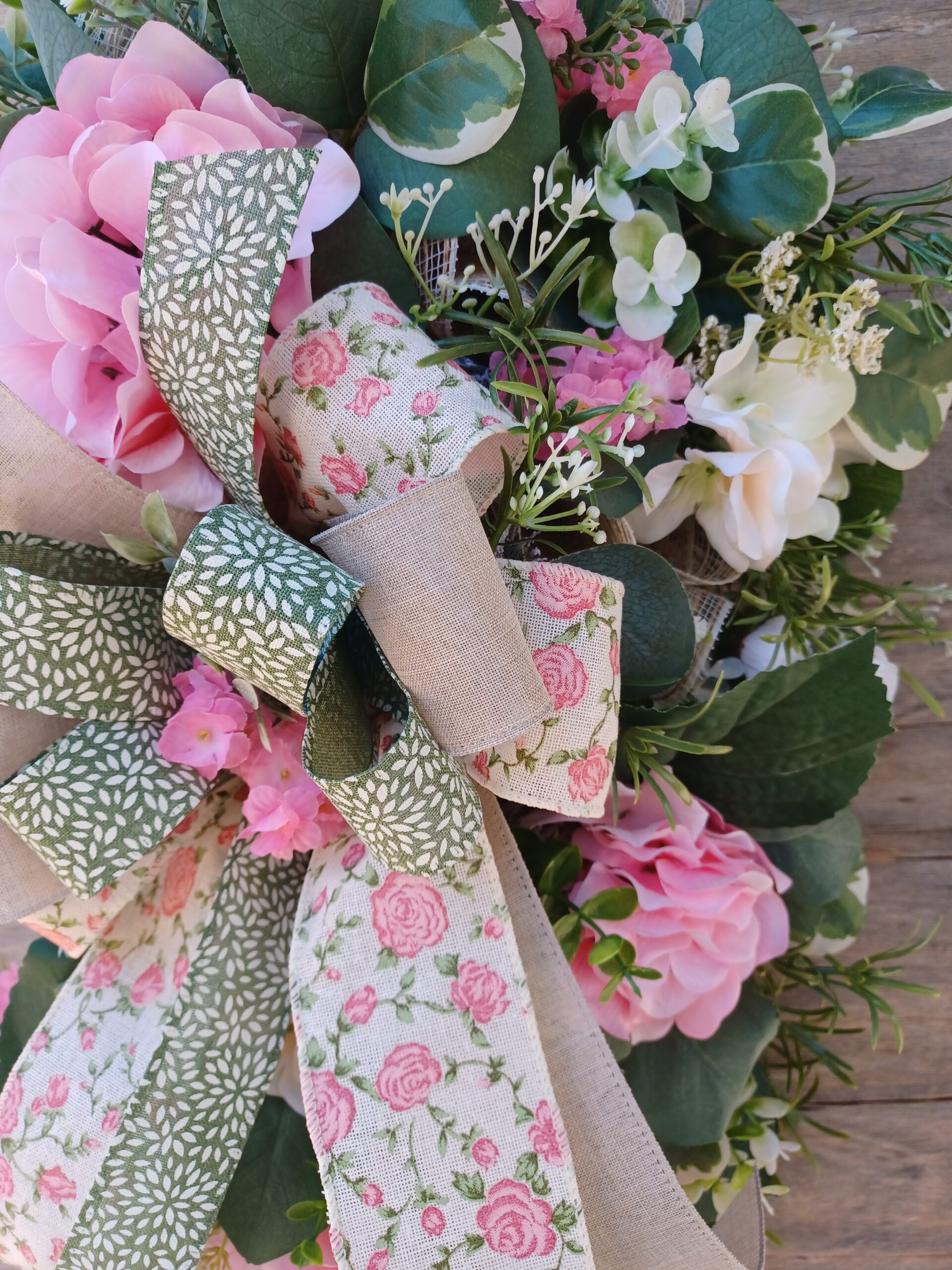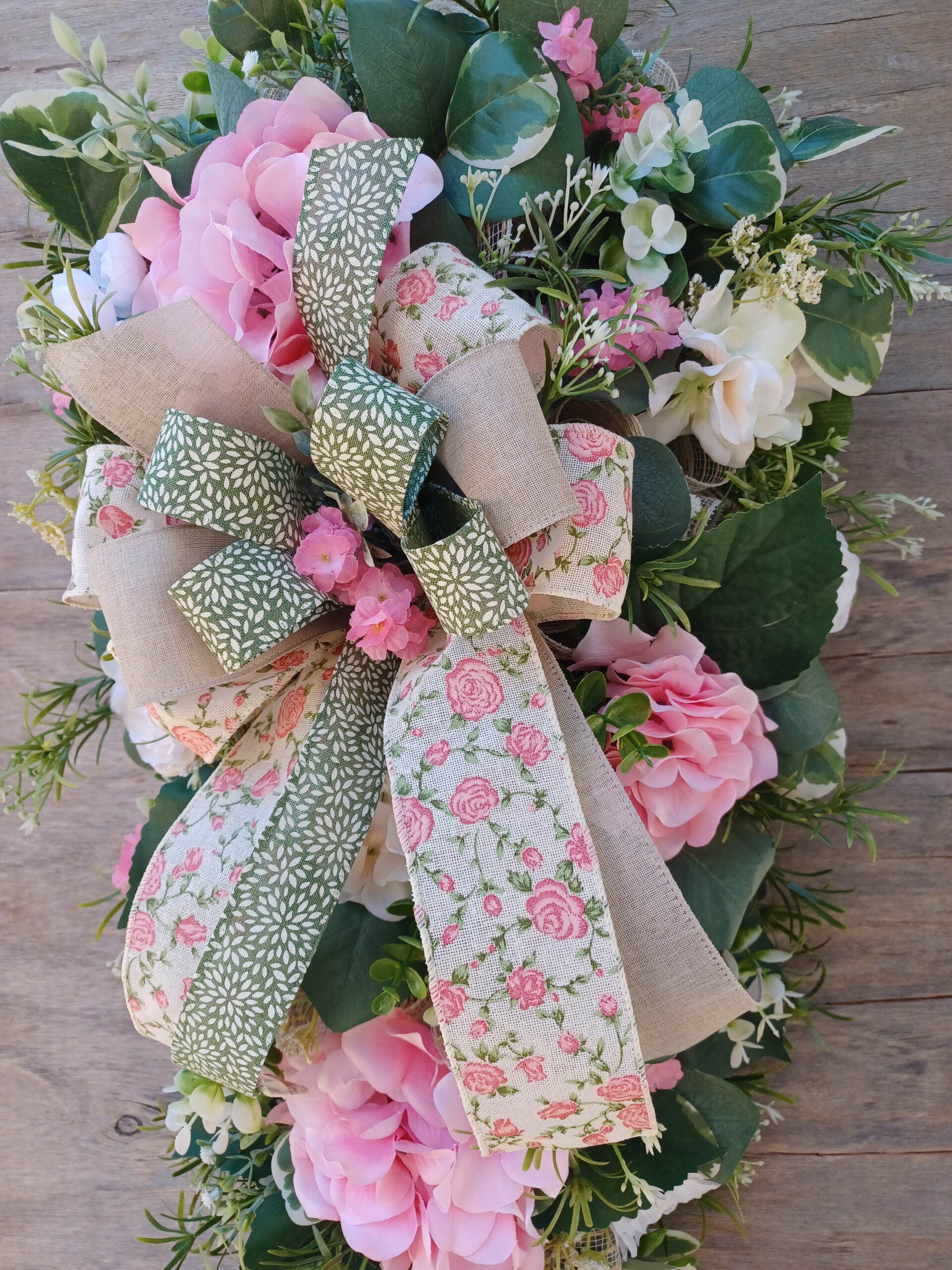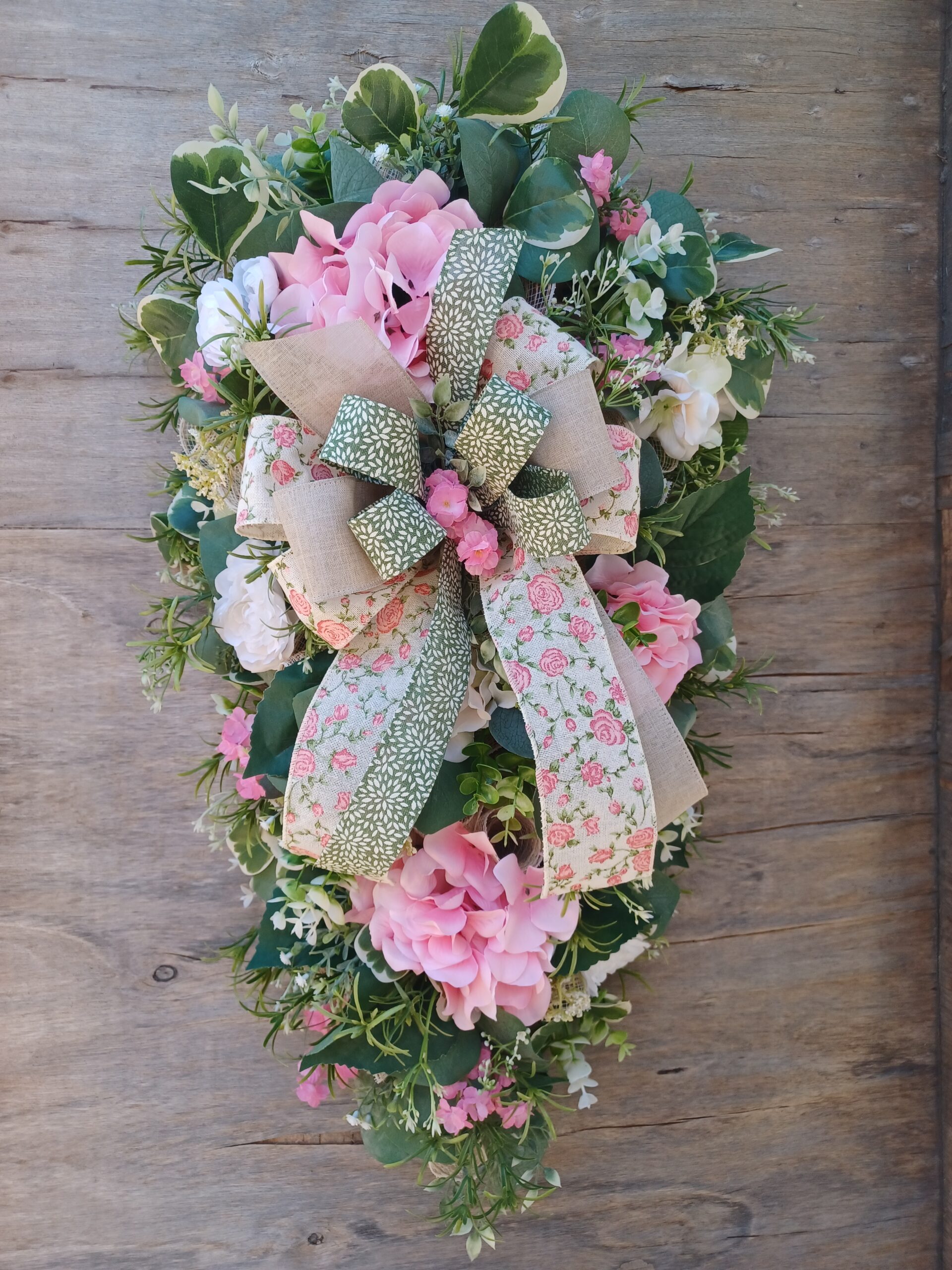 Welcome guests in style with this stunning, one-of-a-kind swag wreath. Crafted on a pine teardrop base, this elegant piece features a beautiful multi-ribbon bow and a vibrant mix of pink hydrangeas, white ranunculus, and delicate mini hydrangea blooms. Accented with rich ficus, variegated eucalyptus, and boxwood greenery, this swag wreath brings a touch of sophistication to any space. Although perfect for spring and summer, its versatile design makes it an ideal choice for year-round display. Hang it on your porch, interior door, or wall to infuse your home with effortless charm and beauty.