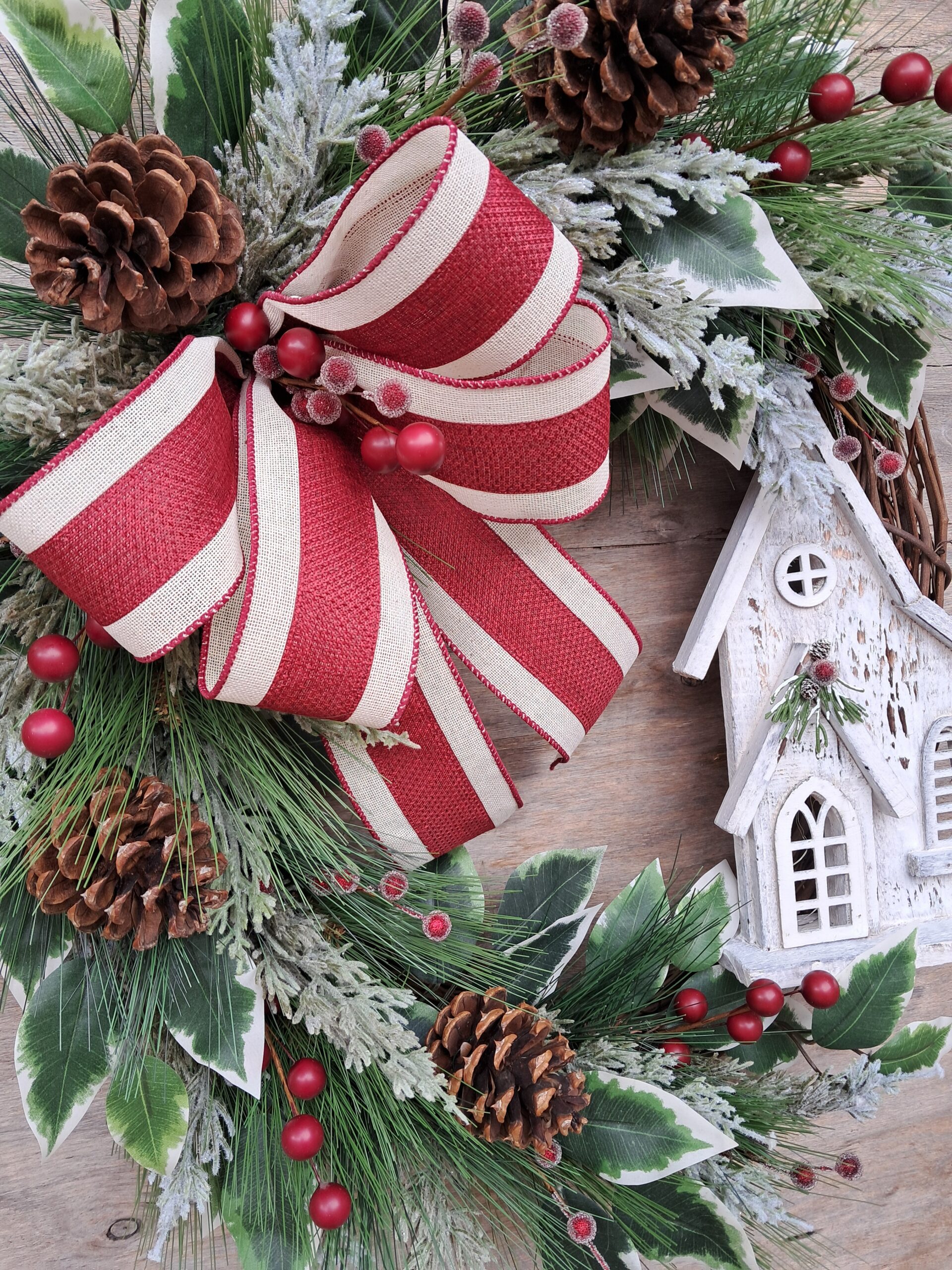 Bring timeless rustic charm to your Christmas decor with this beautifully handcrafted wreath. Built on a natural grapevine base, it features a quaint rustic church that lights up with a soft, warm glow — a battery-operated detail that adds cozy magic to your holiday evenings. Surrounding the church are layers of variegated ficus, long-needle pine, shimmering cedar, pine cones, and rich red berries. A red and ivory bow completes the look, blending festive color with refined, homespun elegance.